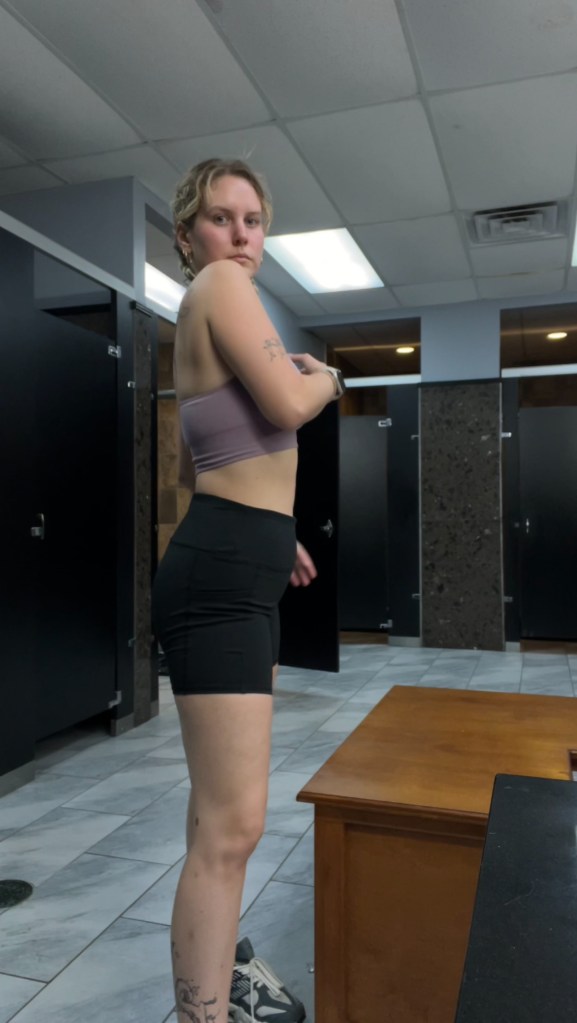 I was up to 190 pounds at this point. i moved back home in 2023, and by the end of the year i was about 196, which was the heaviest i had ever been. i cared, of course i cared, but i didn’t know what to do about it. i couldn’t let myself fall down my path of disordered eating again, but i was so desperate to just be comfortable. i hated every outfit i wore, my confidence went to shit, i cried in the gym, i compared myself to everybody, i didn’t even want my boyfriend of 3 years to look at me naked because i was constantly embarrassed. on top of it all, my coffee shop job was so extremely toxic and mentally draining that it made me constantly miserable and mean, which didn’t help my confidence at all.